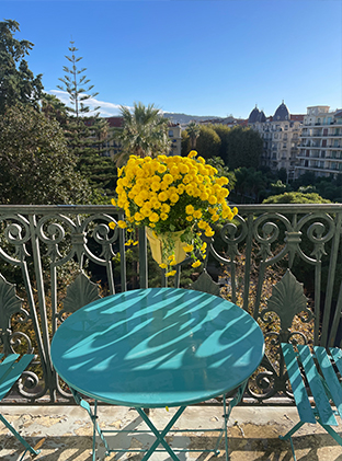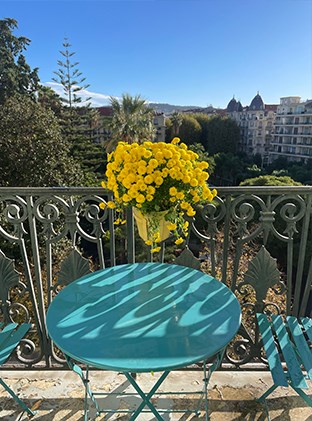 Ejendommen er beliggende i et flot, residentielt kvarter med gode (fødevare)forretninger bag Hotel Negresco, 450 m. fra Promenade des Anglais og stranden. Der er udsigt til parken fra det ene soveværelse og fra dobbeltstuen med fransk balkon. De andre to soveværelser vender mod gården.